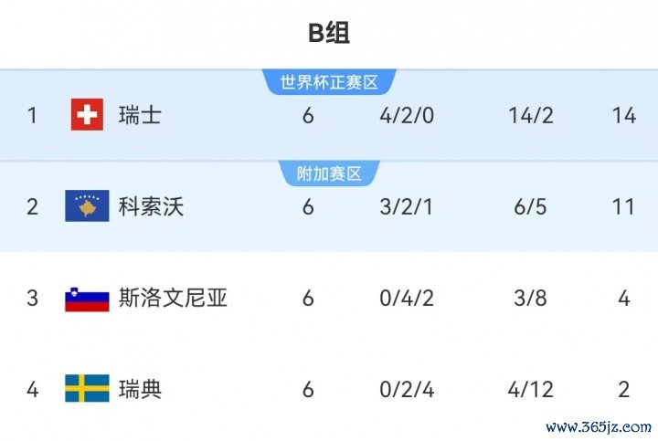 11月19日讯 世初赛欧洲区小组赛的整个比赛仍是一谈猖狂,其中B组瑞士积14分小组第1,科索沃11分小组第2,斯洛文尼亚4分第3,瑞典2分第4。