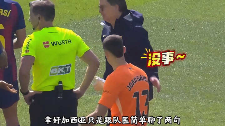 巴萨后备 守门员什琴斯尼这下真被惊出了一身冷汗。在与巴列卡诺的职业联赛 中,本就有伤在身的霍安加西亚突然捂着自己的左膝跪倒在地,主裁也只能中止 赛事 让队医进场。幸好加西亚只是跟队医简单聊了两句,就像没事人一样继续投入到赛事 当中。