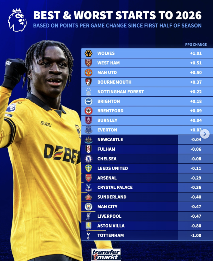 狼队下半赛季至今相比上半赛季场均多得1.01分,高居榜首;西汉姆联和曼联场均分别多得0.51分和0.5分排名二三。排名榜单末尾的是阿斯顿维拉和热刺,他们场均分别少得0.8分和1分。
