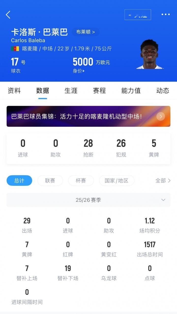 报道称,巴莱巴今夏将再度成为转会市场上的热门球员。由于本赛季球员竞技状态 起伏,布莱顿对他1亿英镑的估值有所下调。而曼联仍在密切关注,这对巴莱巴的经纪队伍 而言无疑是利好消息。