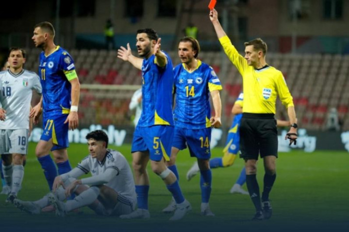 90 分钟战罢,十人作战的意大利与波黑 1-1 战平,赛事 被拖入延长赛 赛。延长赛 赛双方均未能改写比分,残酷的罚球决胜 就此上演。遗憾的是,埃斯波西托、克里斯坦特相继罚失十二码球,意大利最终以罚球决胜 1-4、总比分 2-5 不敌波黑,彻底无缘 2026 年美加墨世界杯赛 。