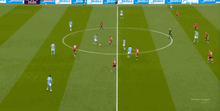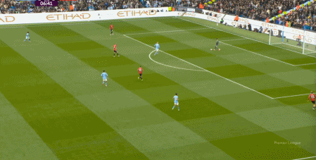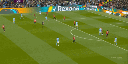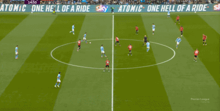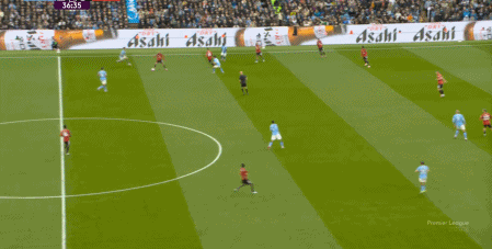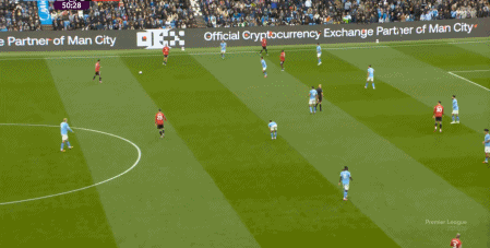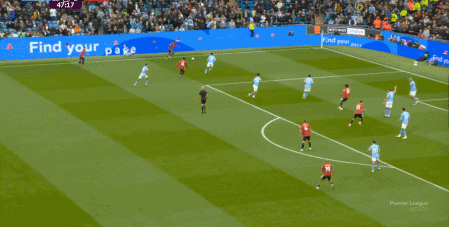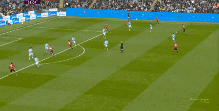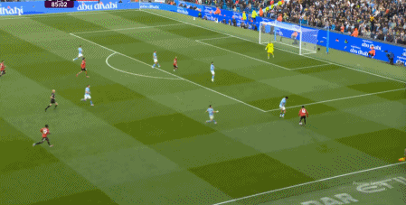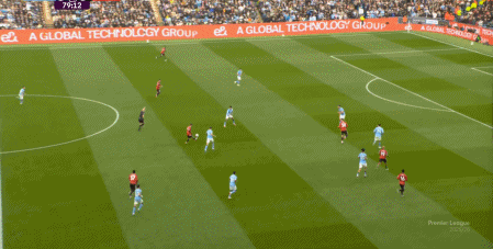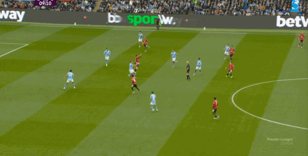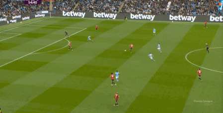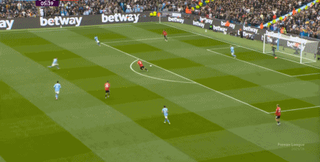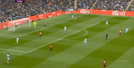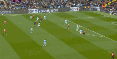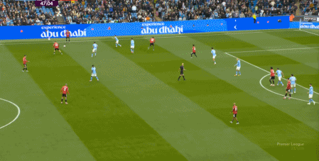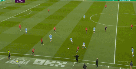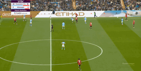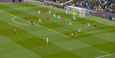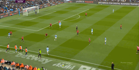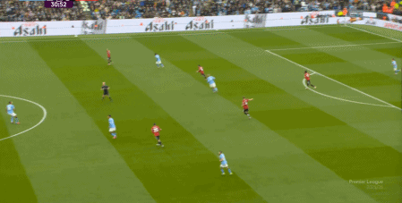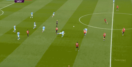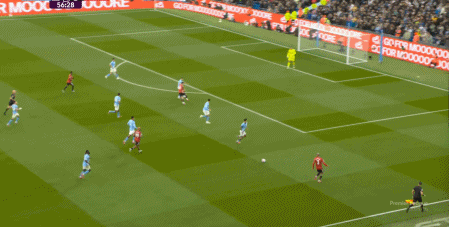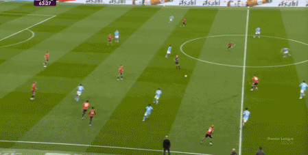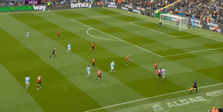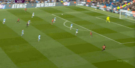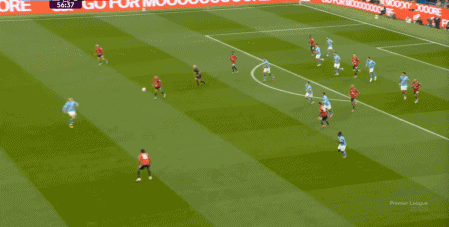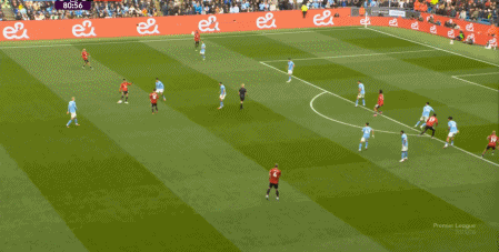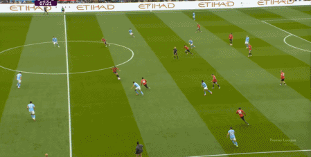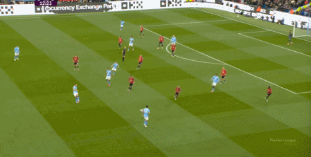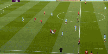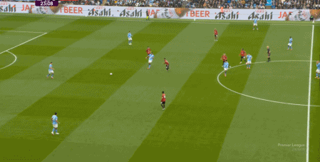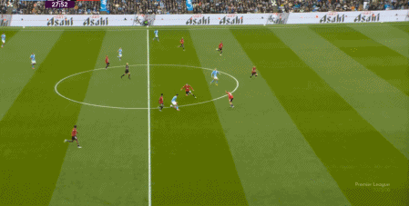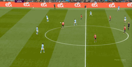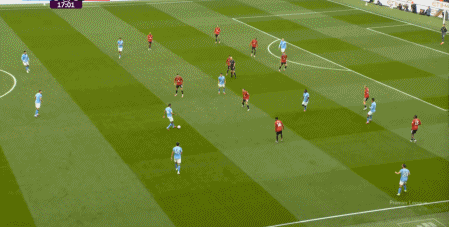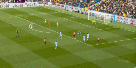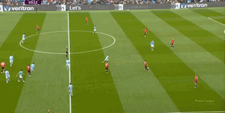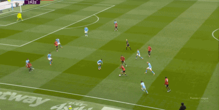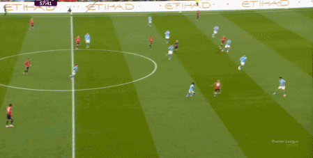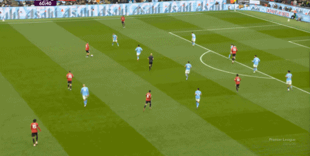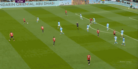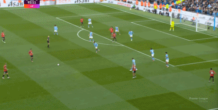 于是在第18分钟,福登和多库都迁徙到了右半扇,在都有两线之间拿球空间的情况下,多库完成了对曼联防地的径直冲破,而福登完成了在中枢区域的穿插,于是前者相接传中,福登则在约罗、布鲁诺和卢克-肖身边完成了头球攻门: