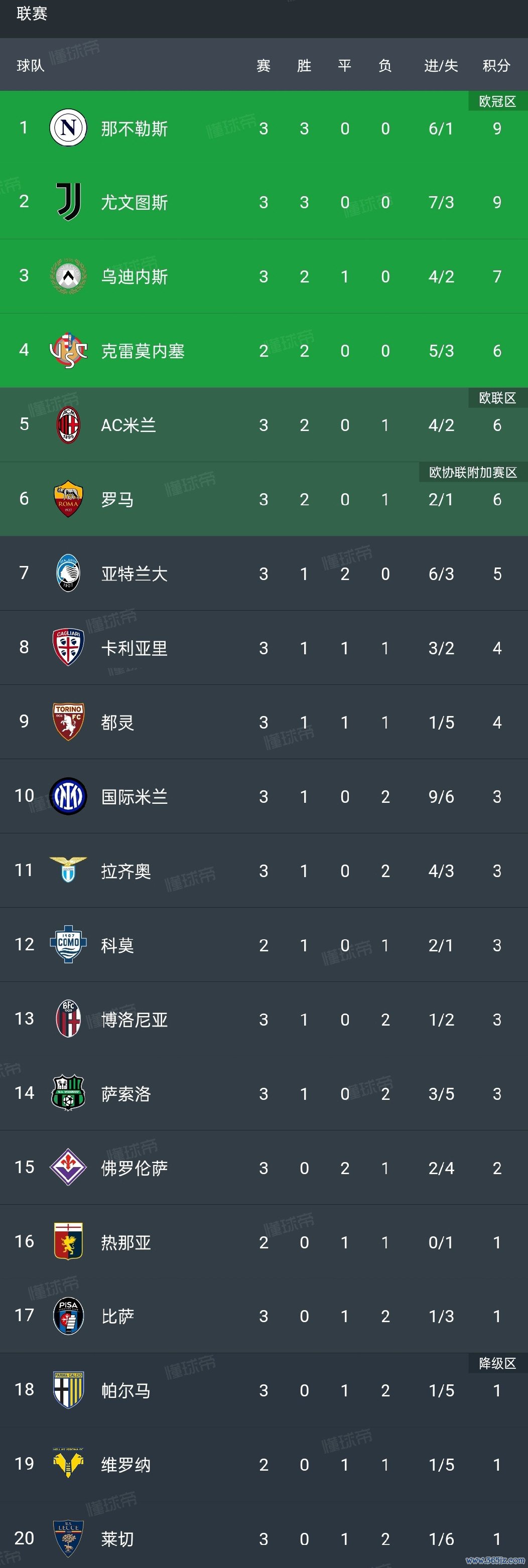 那不勒斯豪取三连胜以净胜球的上风领跑。
