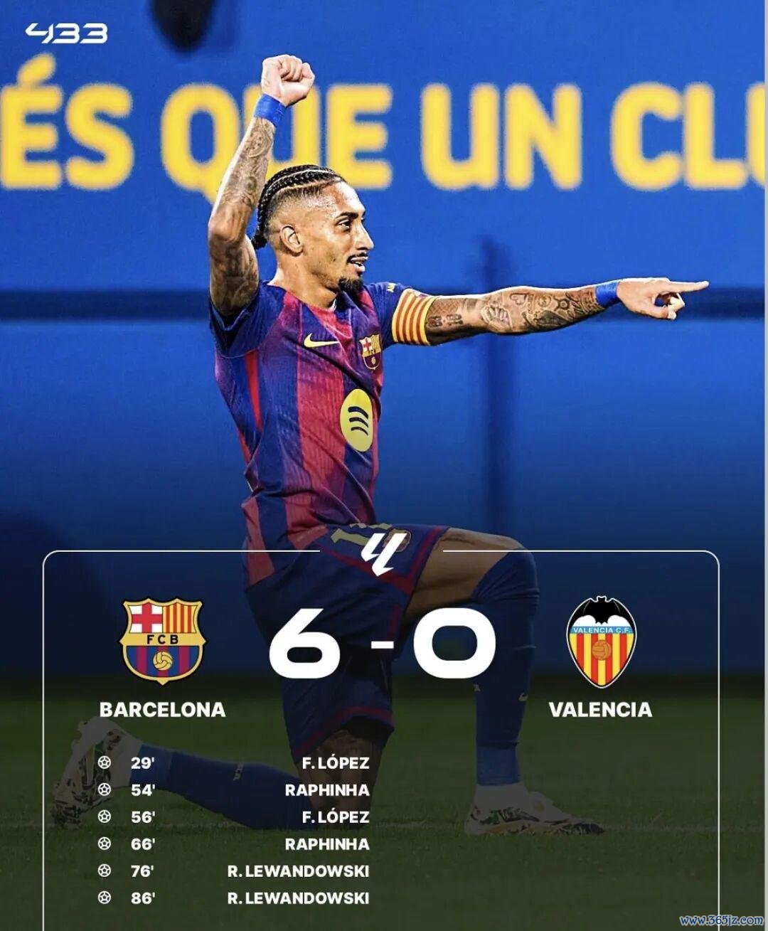 西甲第4轮联赛,巴萨主场迎战瓦伦西亚,本场比赛,尽管亚马尔缺席,然而巴萨依旧是火力全开,莱万、费尔明-洛佩斯、拉菲尼亚均梅开二度,巴萨最终6球大捷敌手。