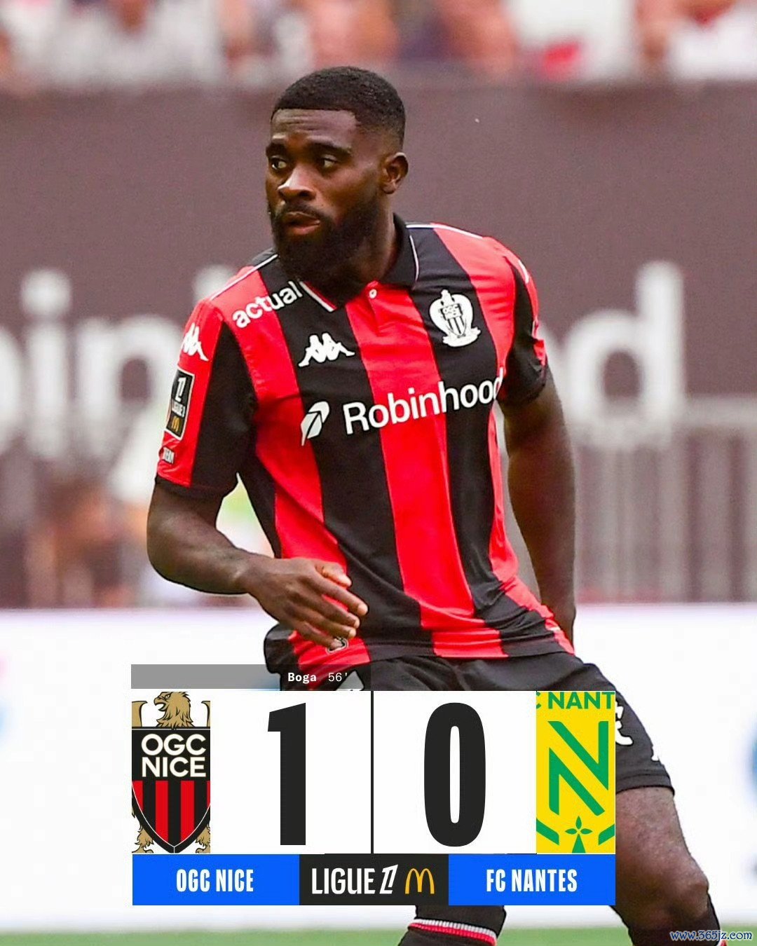 第56分钟,瓦努特助攻博加推射破门,尼斯1-0打败南特。
