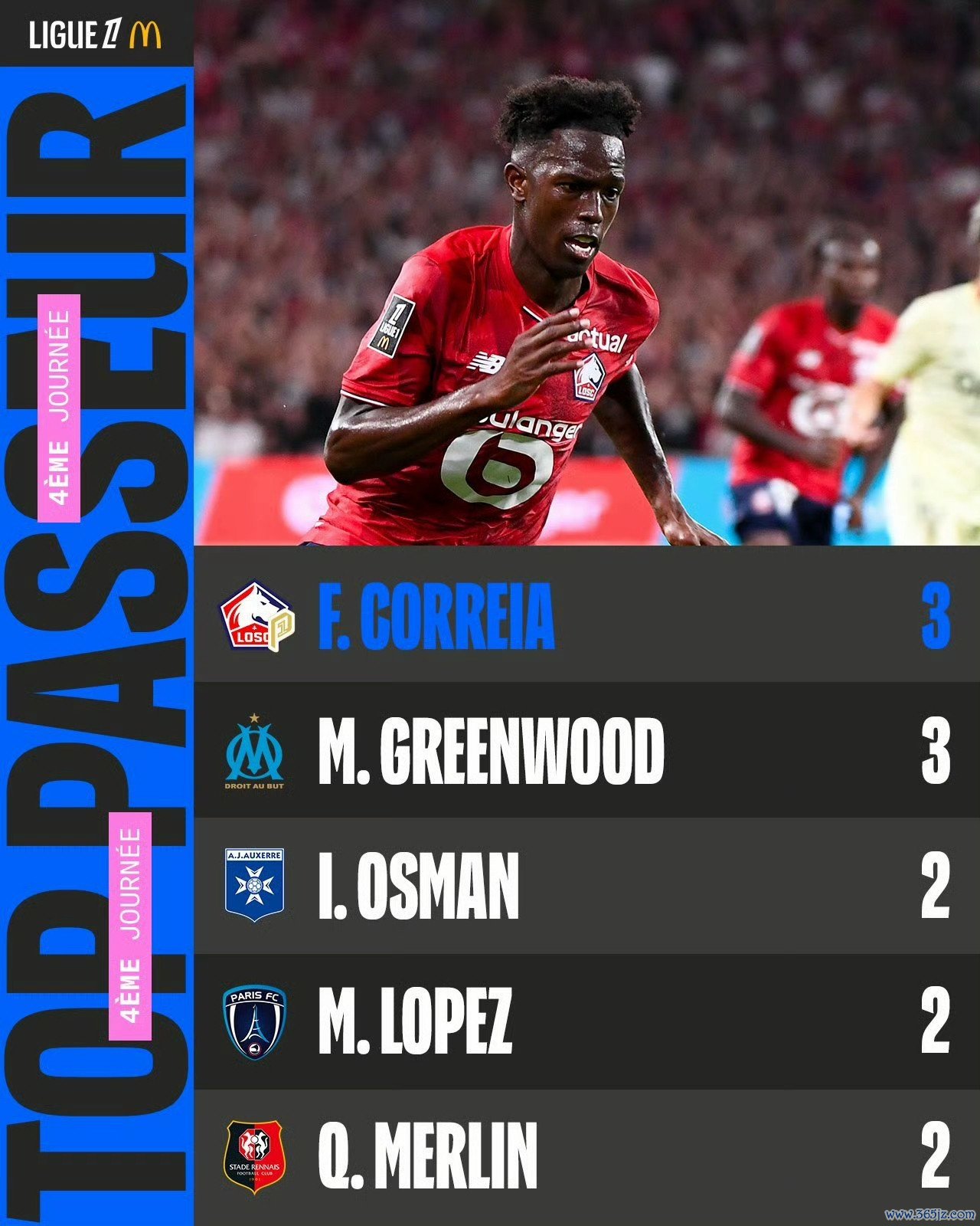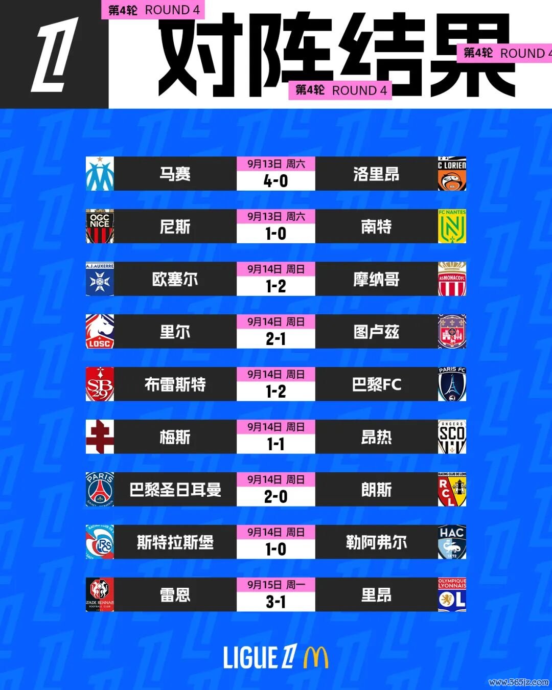 2025/26赛季法甲联赛第4轮于北京工夫9月13日凌晨至15日凌晨分3个比赛日战罢:马赛4-0完胜洛里昂,巴黎圣日耳曼2-0驯顺朗斯,摩纳哥2-1绝杀欧塞尔,雷恩3-1逆转里昂,里尔2-1绝杀图卢兹。