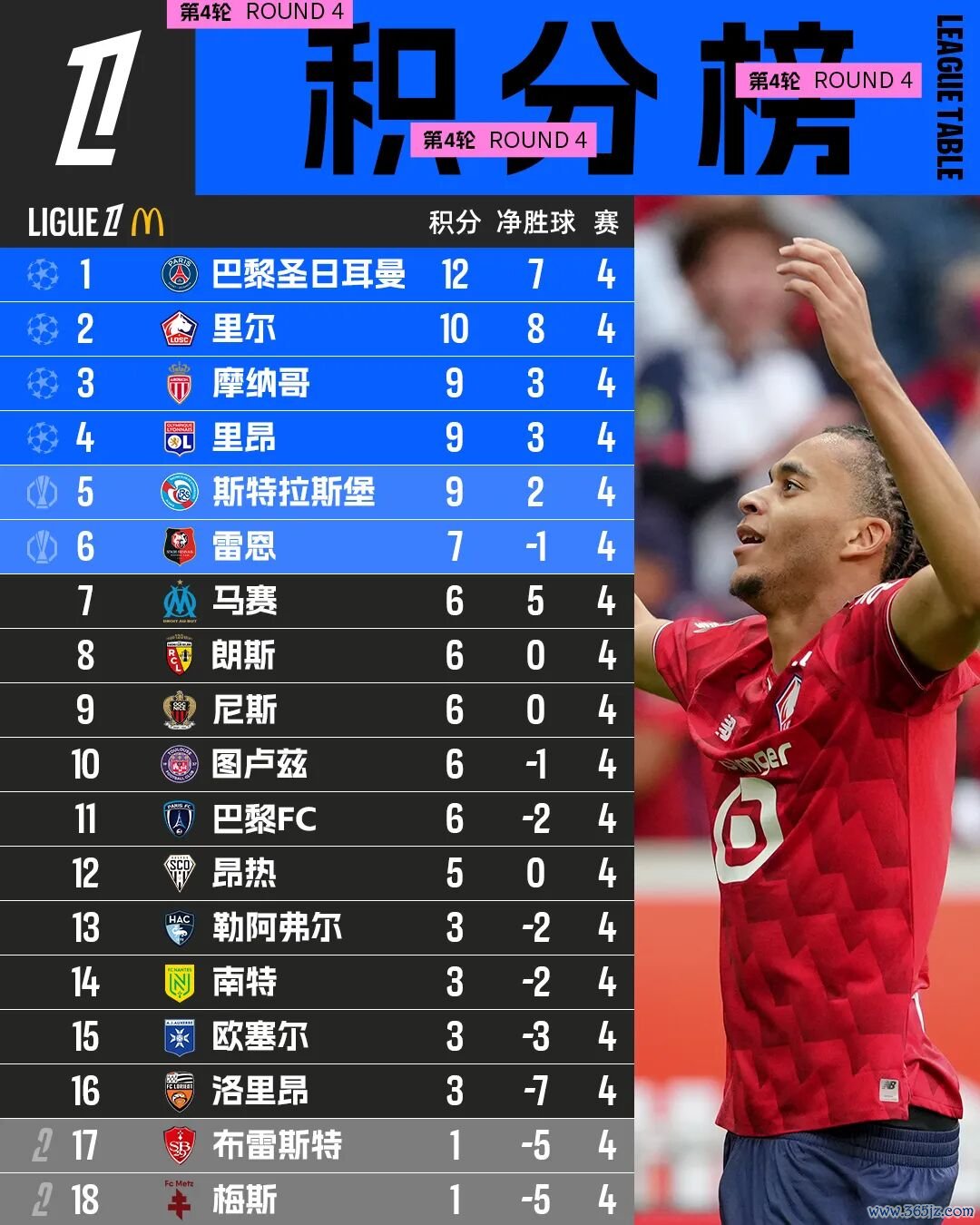 积分榜方面,4战全胜的巴黎圣日耳曼独占积分榜首位,里尔、摩纳哥、里昂紧随自后,仅得一分的布雷斯特和梅斯暂时位于左迁区。