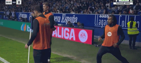 第50分钟,镜头给到场边,莱万、孔德正在热身
