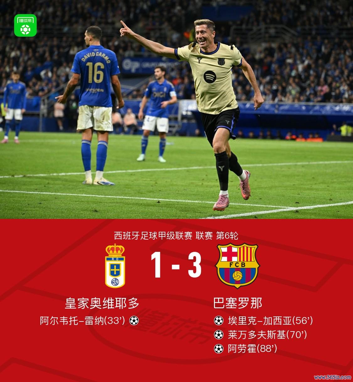 北京时期9月26日西班牙足球甲级联赛 联赛 第6轮,皇家奥维耶多主场对阵巴塞罗那。上半场,巴萨门将霍安-加西亚出击传球疏忽,雷纳吊射破门。下半场,埃里克-加西亚扳平比分。随后,德容传中,莱万头槌反超比分。开出角球,阿劳霍头球得分锁定胜局。全场比赛截止,巴萨客场3-1逆转打败皇家奥维耶多。