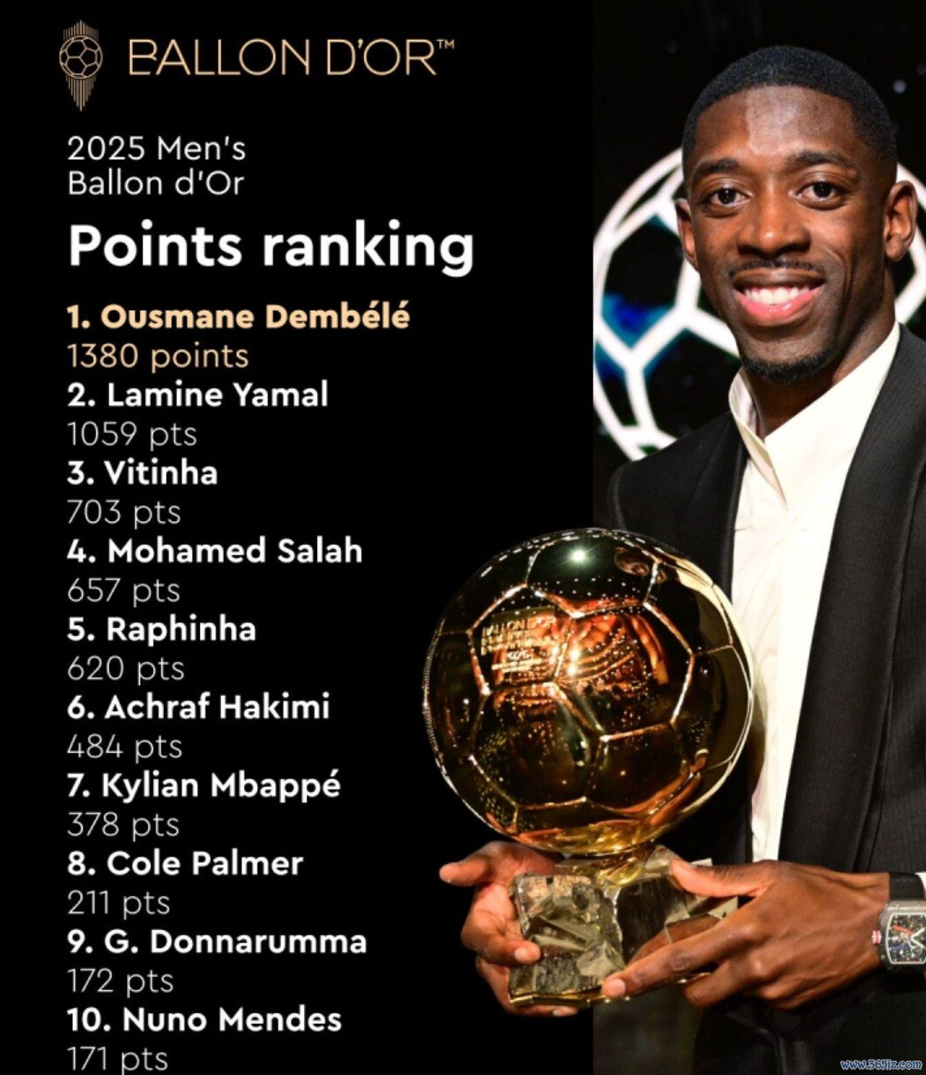 1.登贝莱:1380分2.亚马尔:1059分3.维蒂尼亚:703分4.萨拉赫:657分5.:620分6.阿什拉夫:484分7.:378分8.帕尔默:211分9.多纳鲁马:172分10.努诺-门德斯:171分11.佩德里:124分