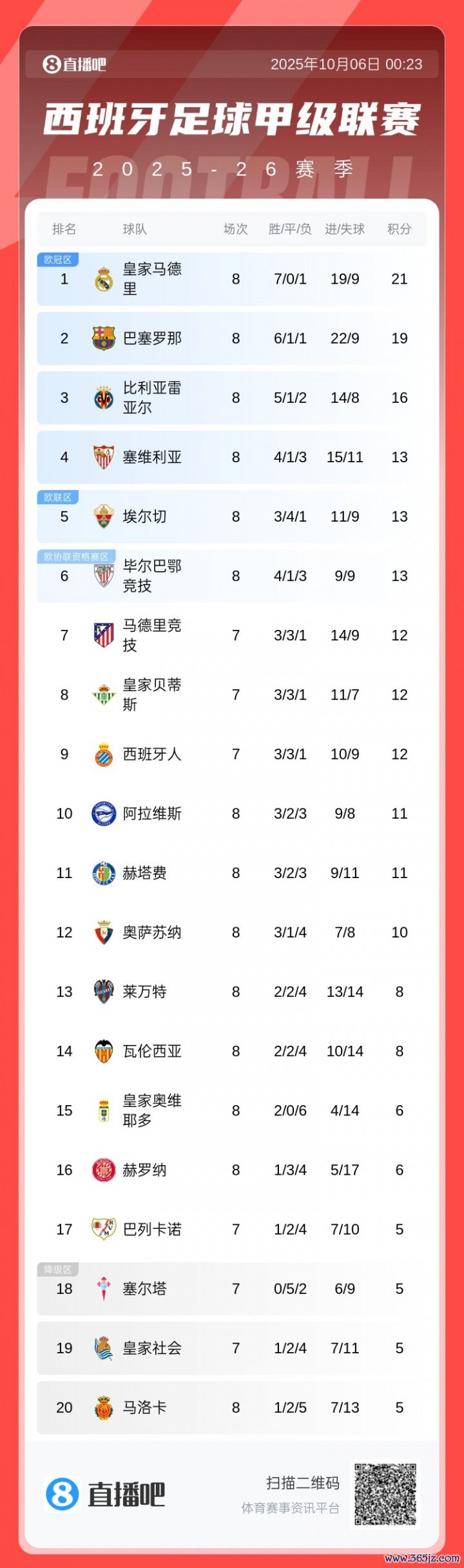 西甲积分榜方面:皇马凭借本轮比赛得胜重返榜首+2分上风领跑!黄潜第3,塞维利亚升至第4,马竞第7。