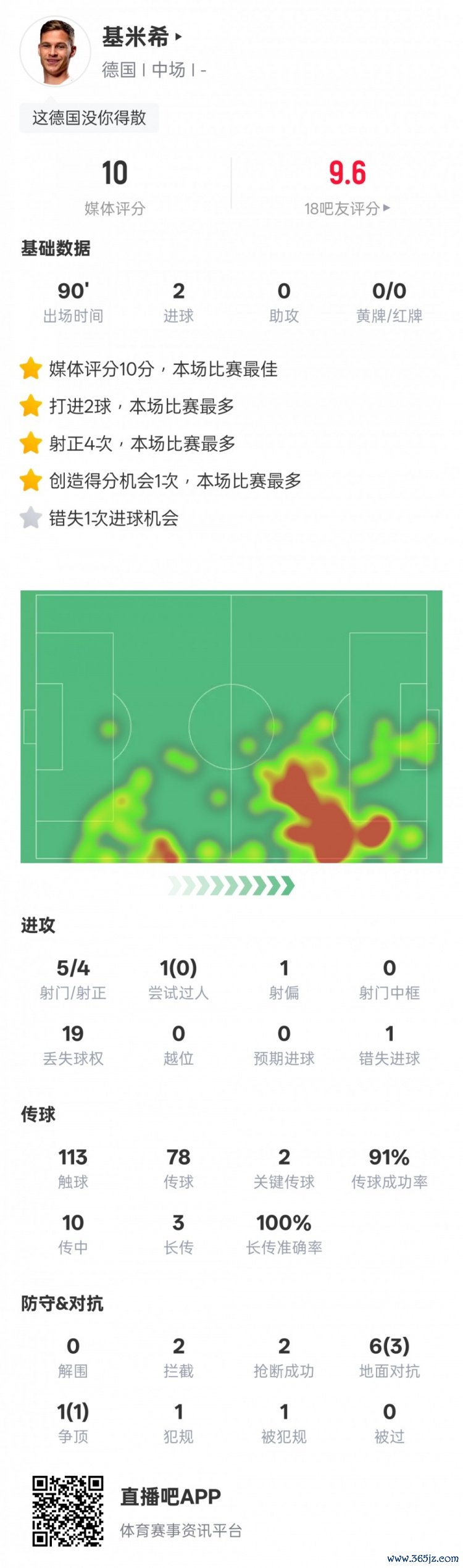 10月11日讯 世初赛欧洲区小组赛A组第3轮,德国4-0卢森堡。基米希首发出战,5次射门4次射正打进2球,送出2次关键传球,评分10.0全场最高。