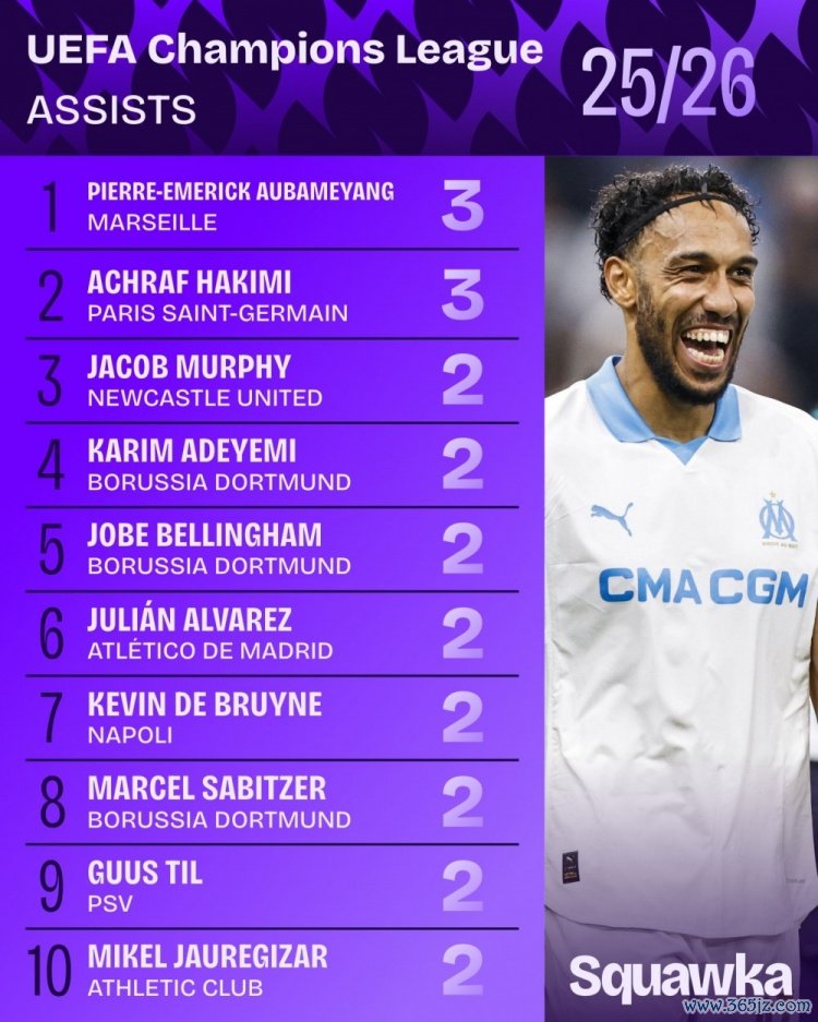 10月23日讯 本赛季欧冠联赛阶段已战罢3轮,Squawka统计了到当今范畴的助攻榜,马赛先锋奥巴梅扬和巴黎后卫阿什拉夫均是3次助攻,分列前二。