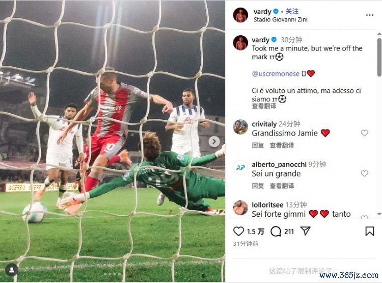 10月26日讯 瓦尔迪今天在Instagram发文,庆祝我方打入克雷莫内塞糊口首球。