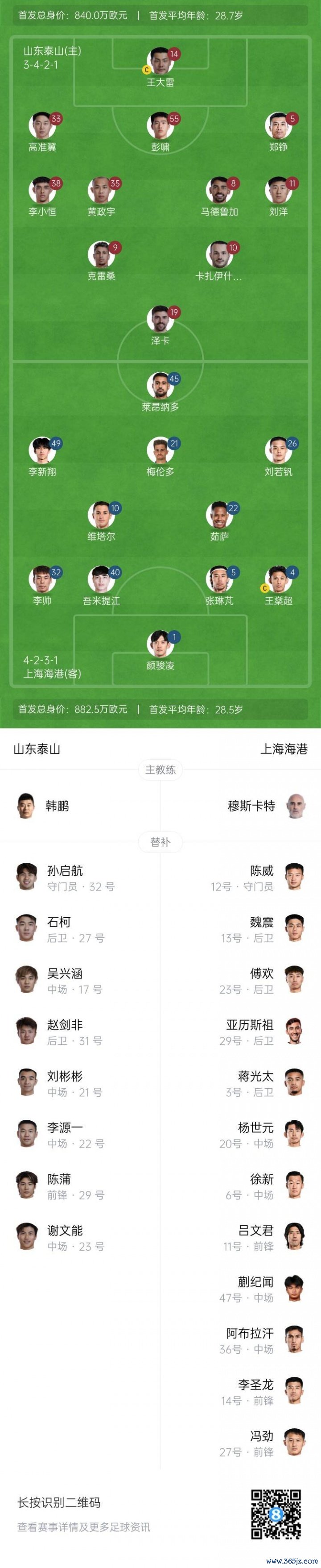 山东泰山首发:14-王大雷、5-郑铮、55-彭啸、11-刘洋、33-高准翼、35-黄政宇、8-马德鲁加(F)、19-泽卡(F)、38-李小恒、10-卡扎伊什维利(F)、9-克雷桑(F)