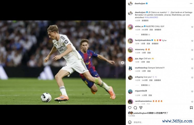 本场比赛赫伊森首发出场,赛后他也在社媒晒出本场像片,配文写说念:“国度德比顺利属于咱们,伯纳乌球场精彩的夜晚,一场难以忘怀的比赛。感谢皇马球迷们创造出如斯强烈的氛围。”
