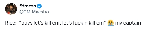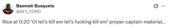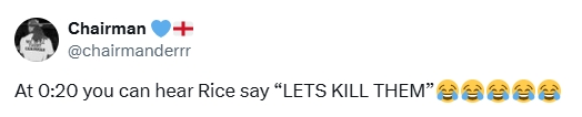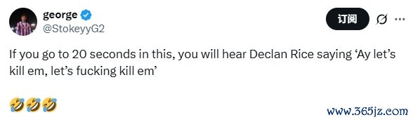 在埃泽下半场刚开场打进第二球,阿森纳3-0杰出时,赖斯在与队友庆祝时朝队友喊谈:“嘿!让咱们杀了他们,他X的杀了他们吧!”好多球迷在外交媒体指出,转播镜头了了捕捉到了赖斯的这句话。