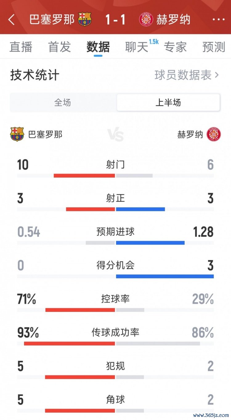 10月18日讯 本轮西甲巴萨对阵赫罗纳上半场戒指,两边暂时1-1战平,以下为两边半场数据对比: