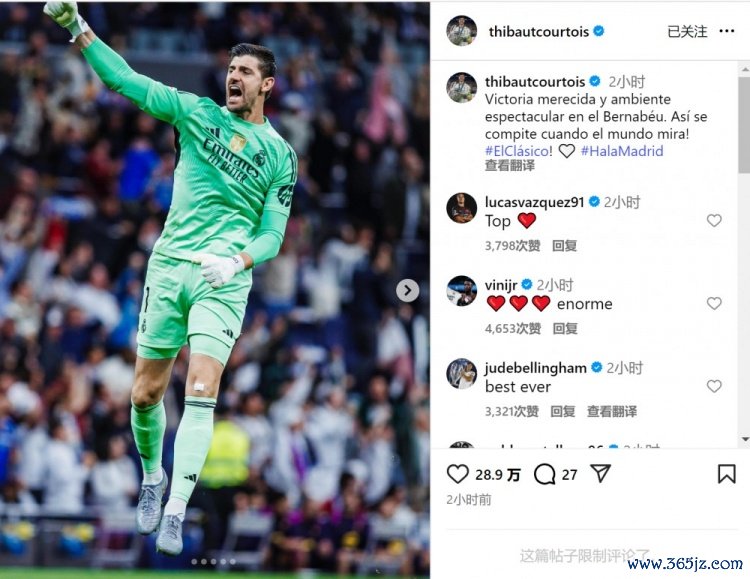 皇马门将库尔图瓦社媒晒照庆祝顺利,配文:“实至名归的顺利,伯纳乌球场的氛围轰动东谈主心,在举世瞩筹画比赛中就该有这么的推崇!”