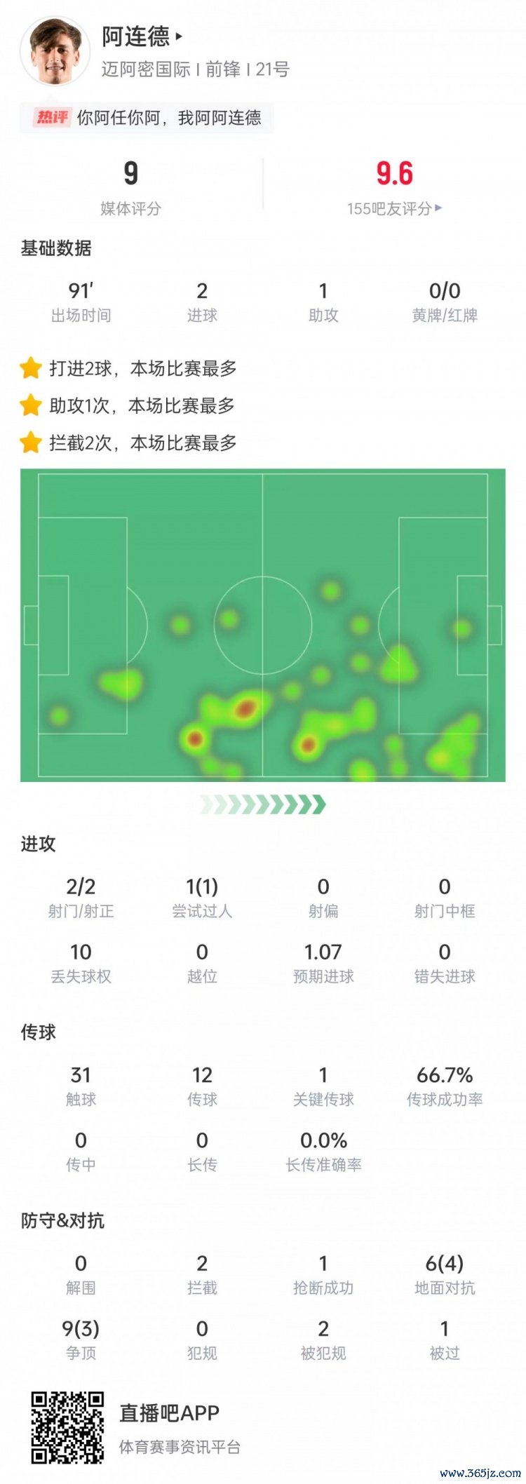 11月9日讯 好意思职联季后赛首轮第三场比赛,阿连德2射1传,匡助迈阿密外洋主场4-0打败纳什维尔,晋级下一轮。