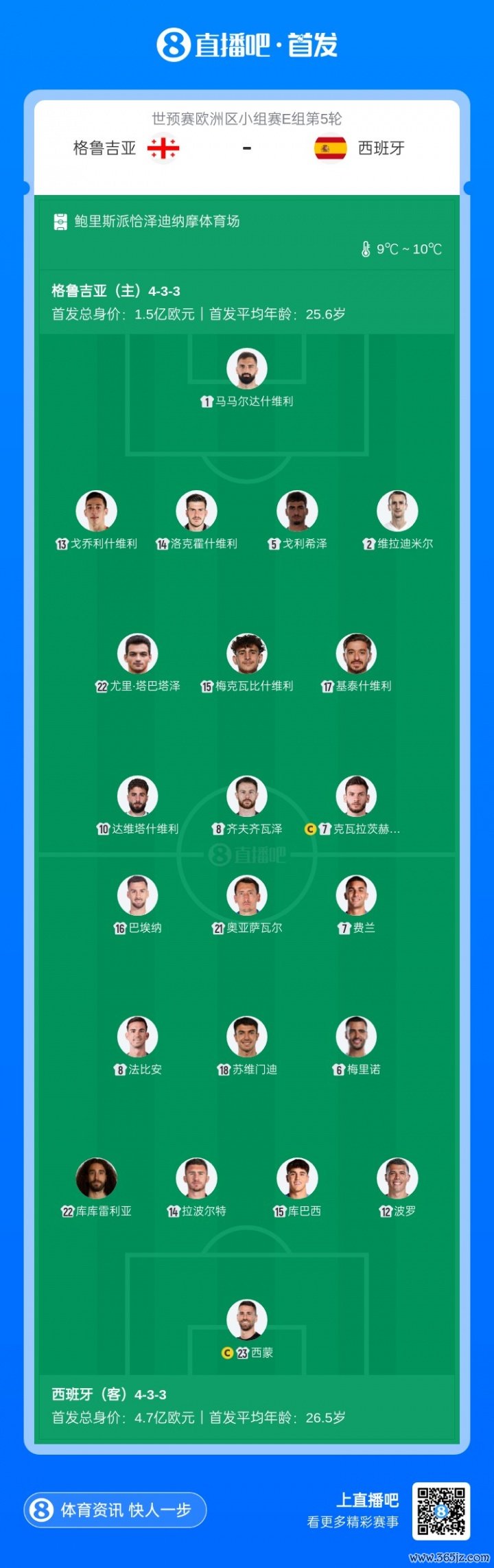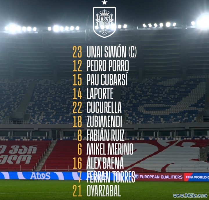 11月15日讯 北京时分11月16日凌晨1:00,寰宇杯欧洲区预选赛E组第5轮,格鲁吉亚vs西班牙。赛前西班牙当先公布了首发声势。【西班牙方面,佩德里、亚马尔等多东谈主伤缺,费兰、奥亚萨瓦尔先发;格鲁吉亚方面,克瓦拉茨赫利亚登场。】
